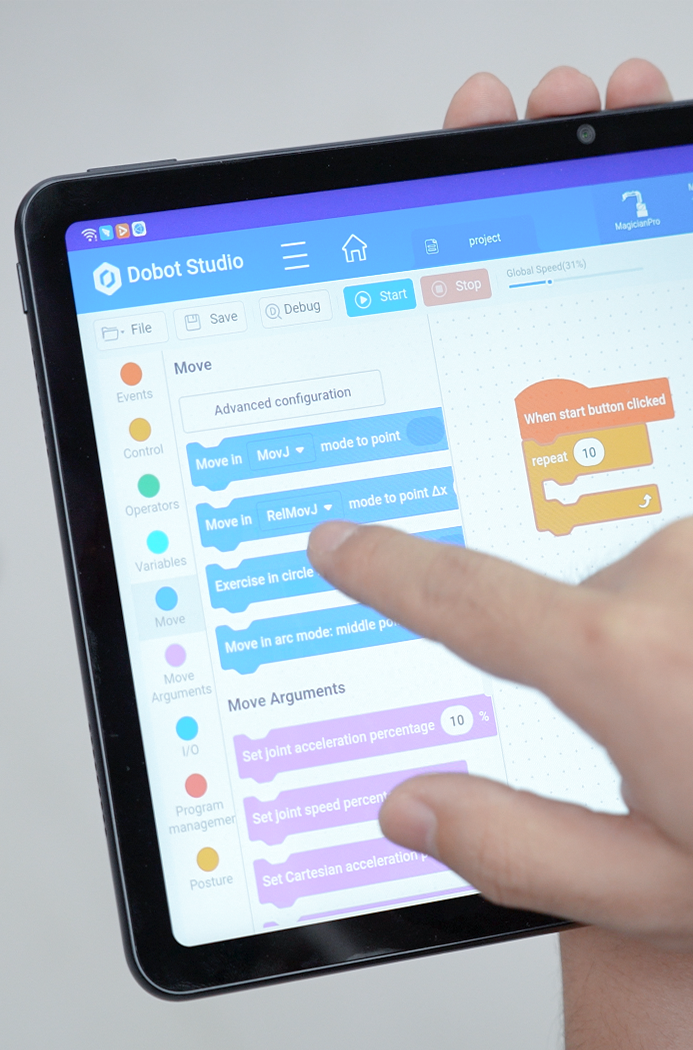 Offering trajectory reproduction, graphical programming, and Lua script programming, which are ideal for applications of different complexity and developers with different programming skills. Intuitive programming interface and guided-interactive design greatly improve efficiency and lower the barriers of robot applications.