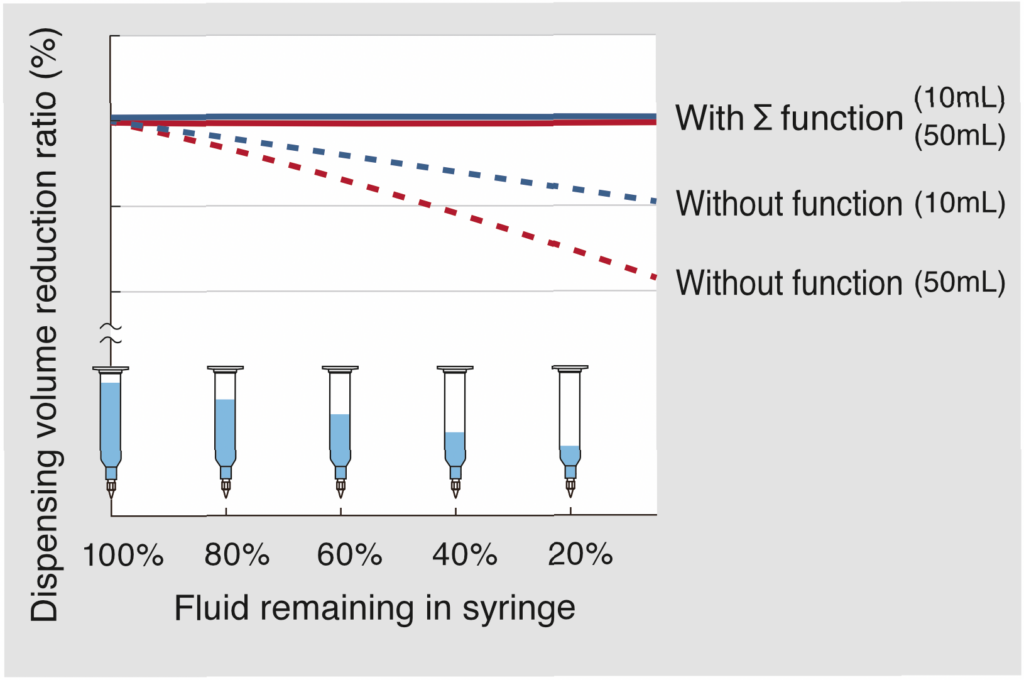 Correction of reduction in dispensing amount caused by the effects of decreased syringe volume. Delivers reliable, high-precision dispensing throughout the entire syringe.