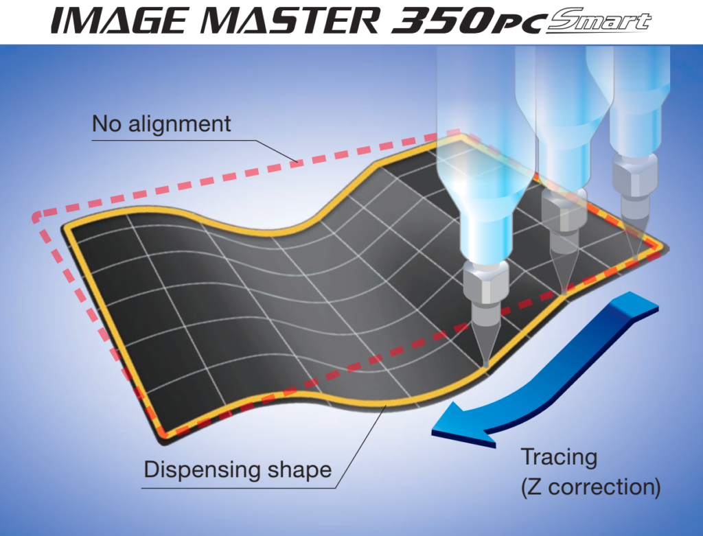 The 3D alignment and tracing functions enable “tracing (Z correction)” that provides XYθ correction to suit tilted or deformed pallets or workpieces, and maintains a constant clearance with warping or distortion. This ensures more reliable dispensing. Now the dispensing track can be corrected to suit fluctuations in the shape of the workpiece.